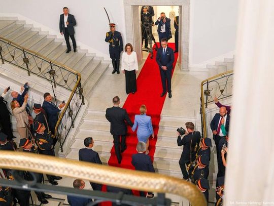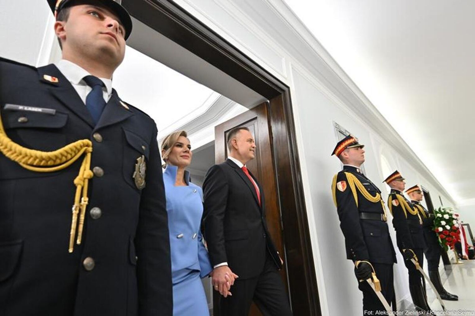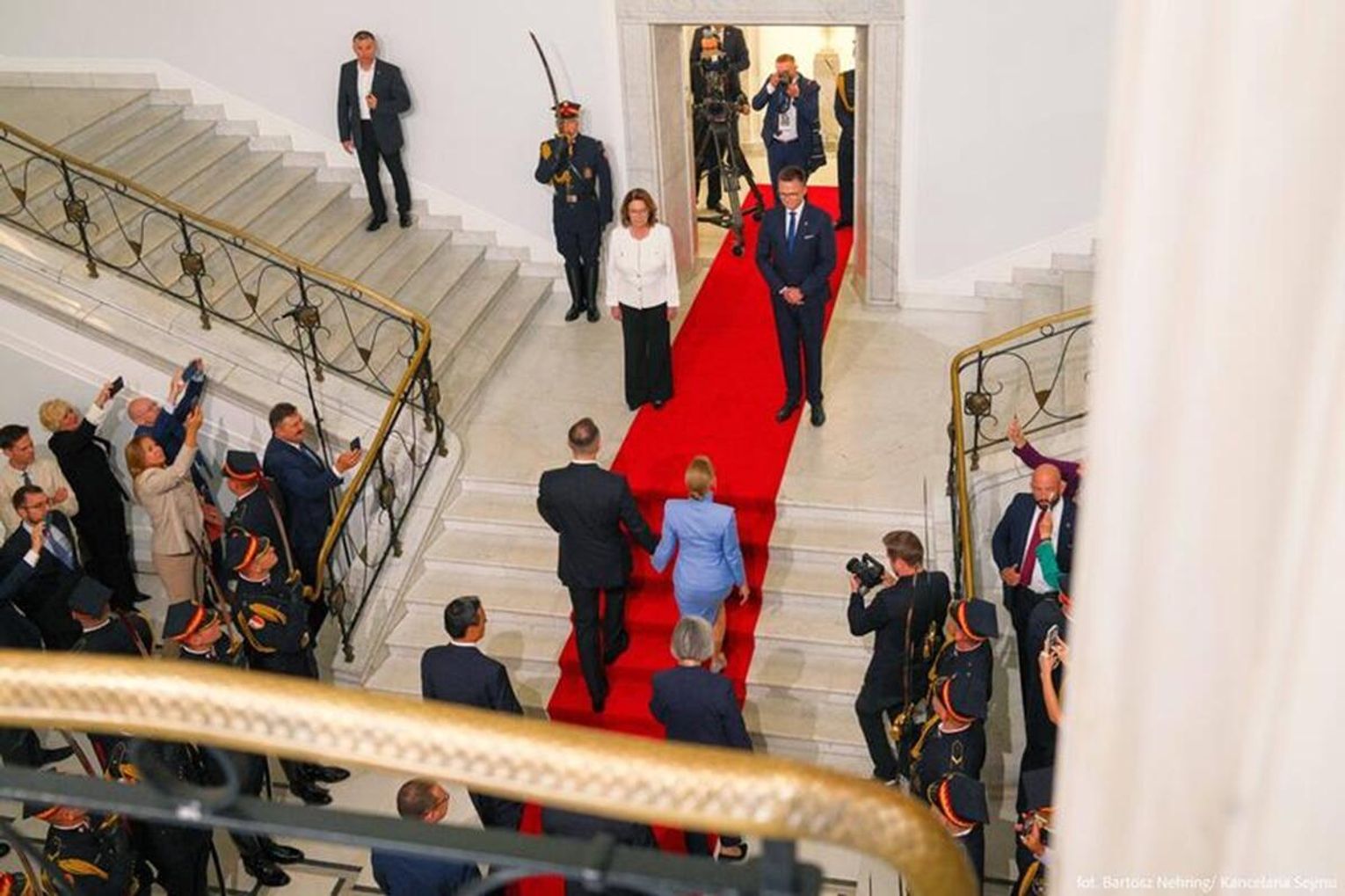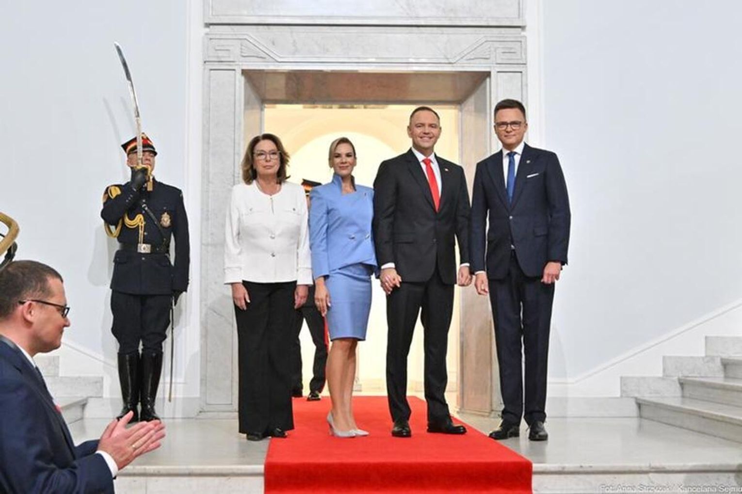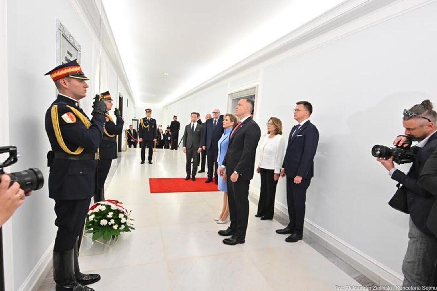 Prezydenta i pierwszą damę Martę Nawrocką powitali marszałek Sejmu Szymon Hołownia oraz marszałek Senatu Małgorzata Kidawa-Błońska. W uroczystości powitania pary prezydenckiej wzięli też udział szefowie Kancelarii Sejmu i Senatu, a uroczystą oprawę zapewniła Straż Marszałkowska.