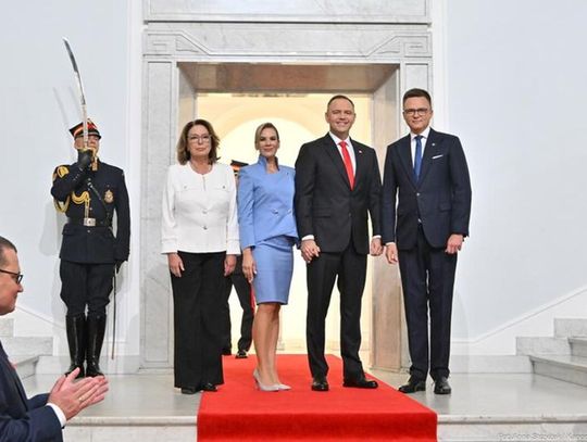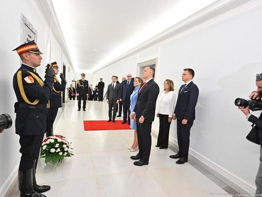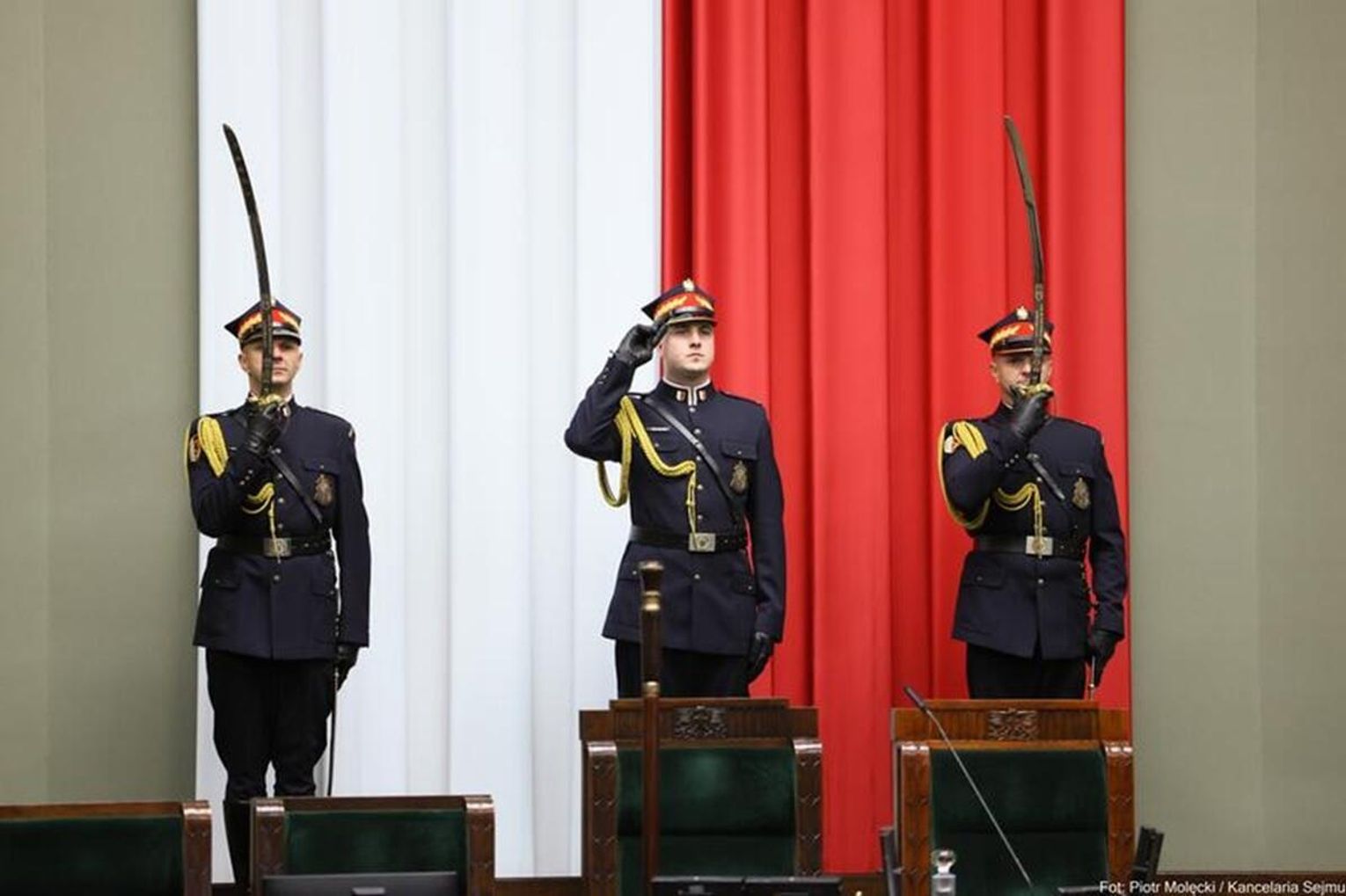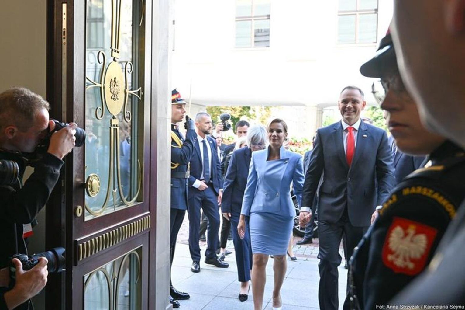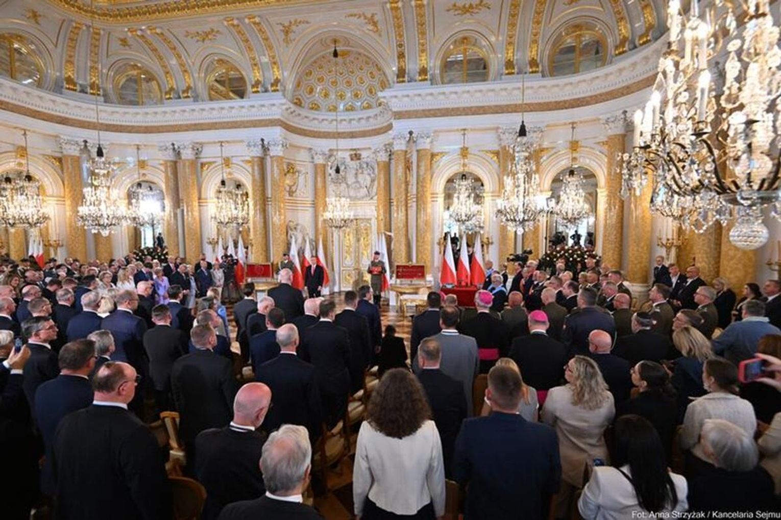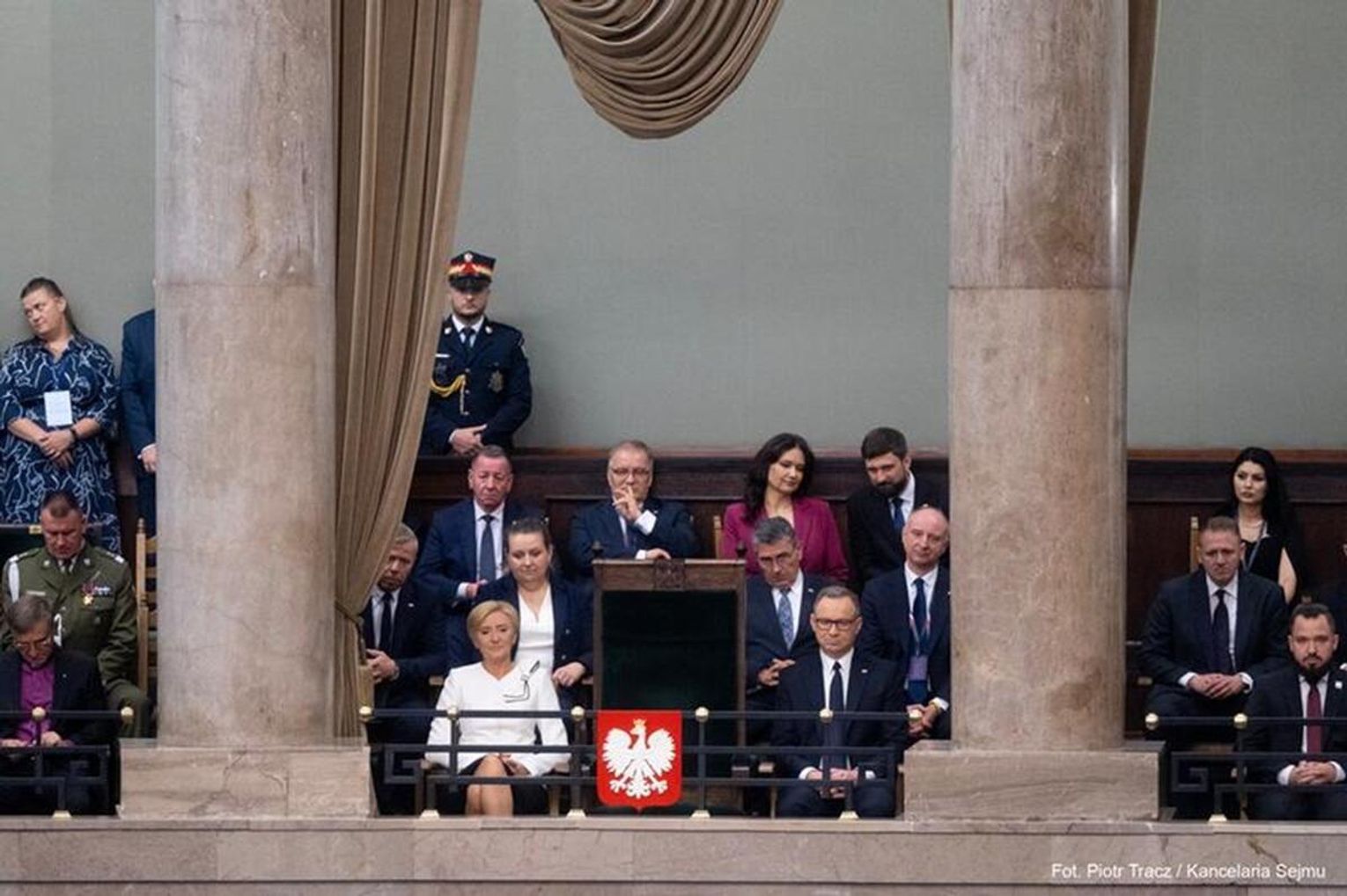 Prezydenta i pierwszą damę Martę Nawrocką powitali marszałek Sejmu Szymon Hołownia oraz marszałek Senatu Małgorzata Kidawa-Błońska. W uroczystości powitania pary prezydenckiej wzięli też udział szefowie Kancelarii Sejmu i Senatu, a uroczystą oprawę zapewniła Straż Marszałkowska.