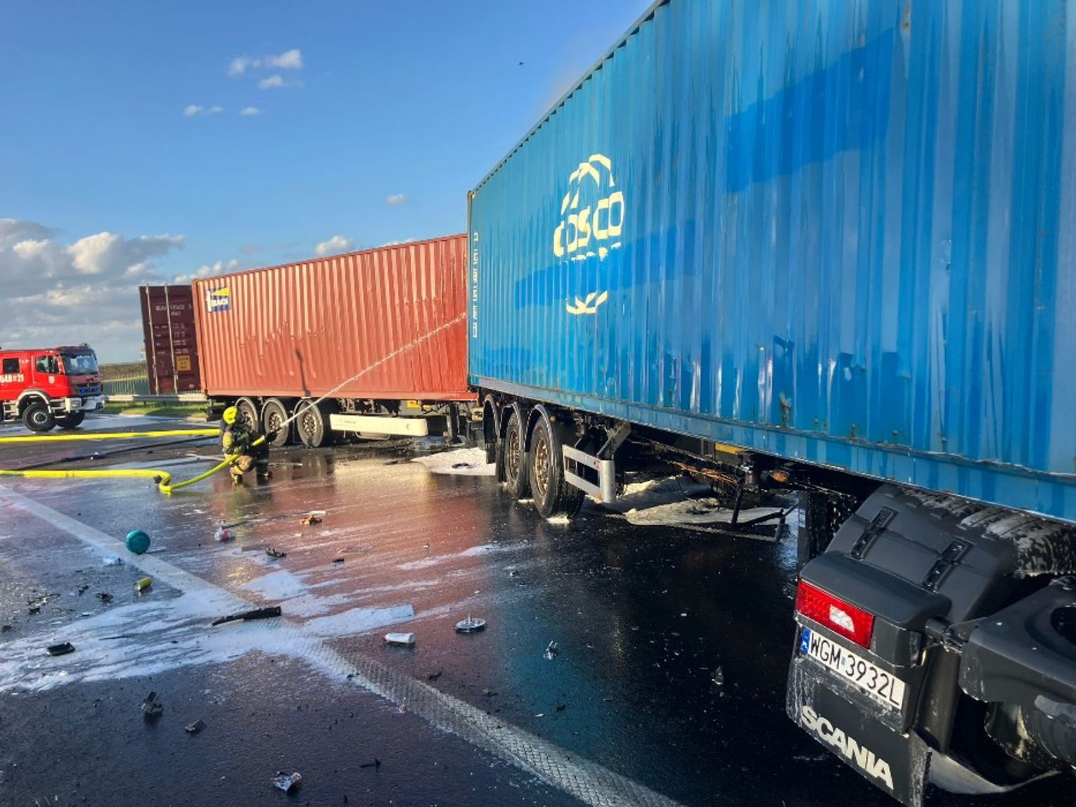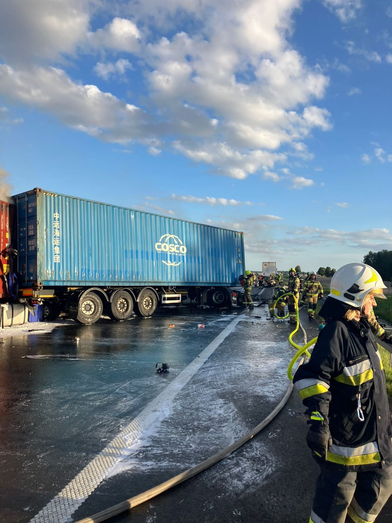 - W wyniku wypadku droga została całkowicie zablokowana - informuje mł. Kpt. Konrad Majewski, z-ca rzecznika prasowego KP PSP w Tczewi. - Łącznie 4 pojazdy: 3 ciężarowe i bus. Dwa samochody ciężarowe uległy pożarowi (płon) Zadysponowaliśmy łączni 10 zastępów jednostek straży pożarnej. Na miejscu pracuje obecnie kilka ZRM. Trwa ustalanie ilości poszkodowanych.