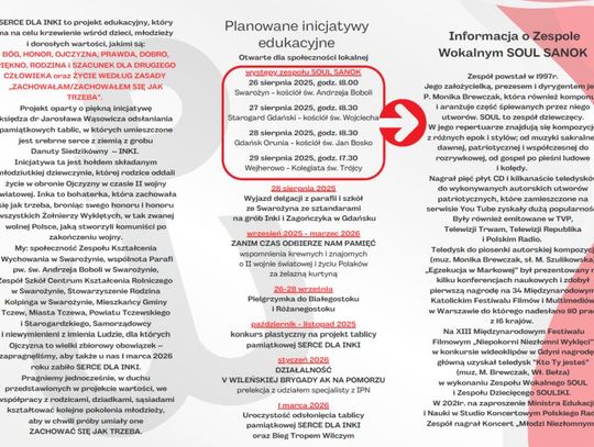Proboszcz parafii św. Andrzeja Boboli oraz organizatorzy koncertów i uroczystości proszą media pomorskie o informowanie swoich widzów, słuchaczy i czytelników o pobycie Soul Sanok w Swarożynie, Starogardzie, Gdańsku i Wejherowie oraz o idei Serca dla „Inki” i programie tego pięknego projektu edukacyjnego w Swarożynie – od dziś aż do 1 marca 2026 roku.
