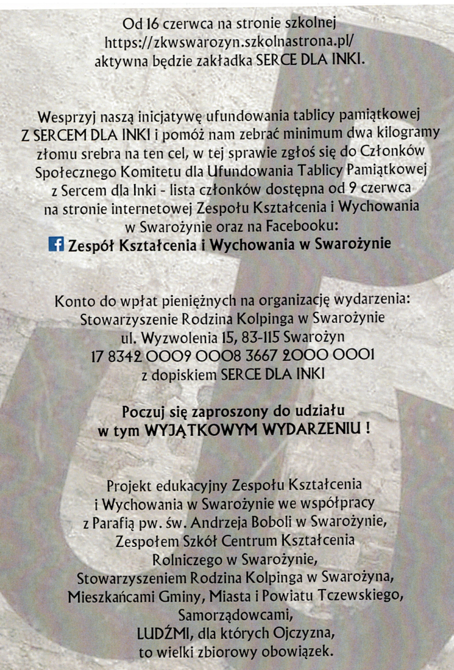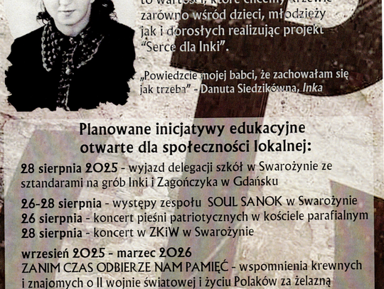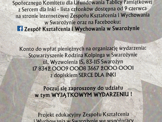 Warto podkreślić, że animatorką całej akcji, której finałem będzie poświęcenie Serca dla „Inki” 1 marca 2026 roku, jest nauczycielka historii w Zespole Kształcenia i Wychowania – Anna Krykowska – która od lat imponuje rodzicom dzieci i mieszkańcom Swarożyna pięknymi inicjatywami na polu patriotycznej edukacji dzieci i dorosłych. Pani Anna cieszy się wsparciem swych działań wśród nauczycieli i dyrekcji szkoły oraz poparciem ks. proboszcza Piotra Malinowskiego.