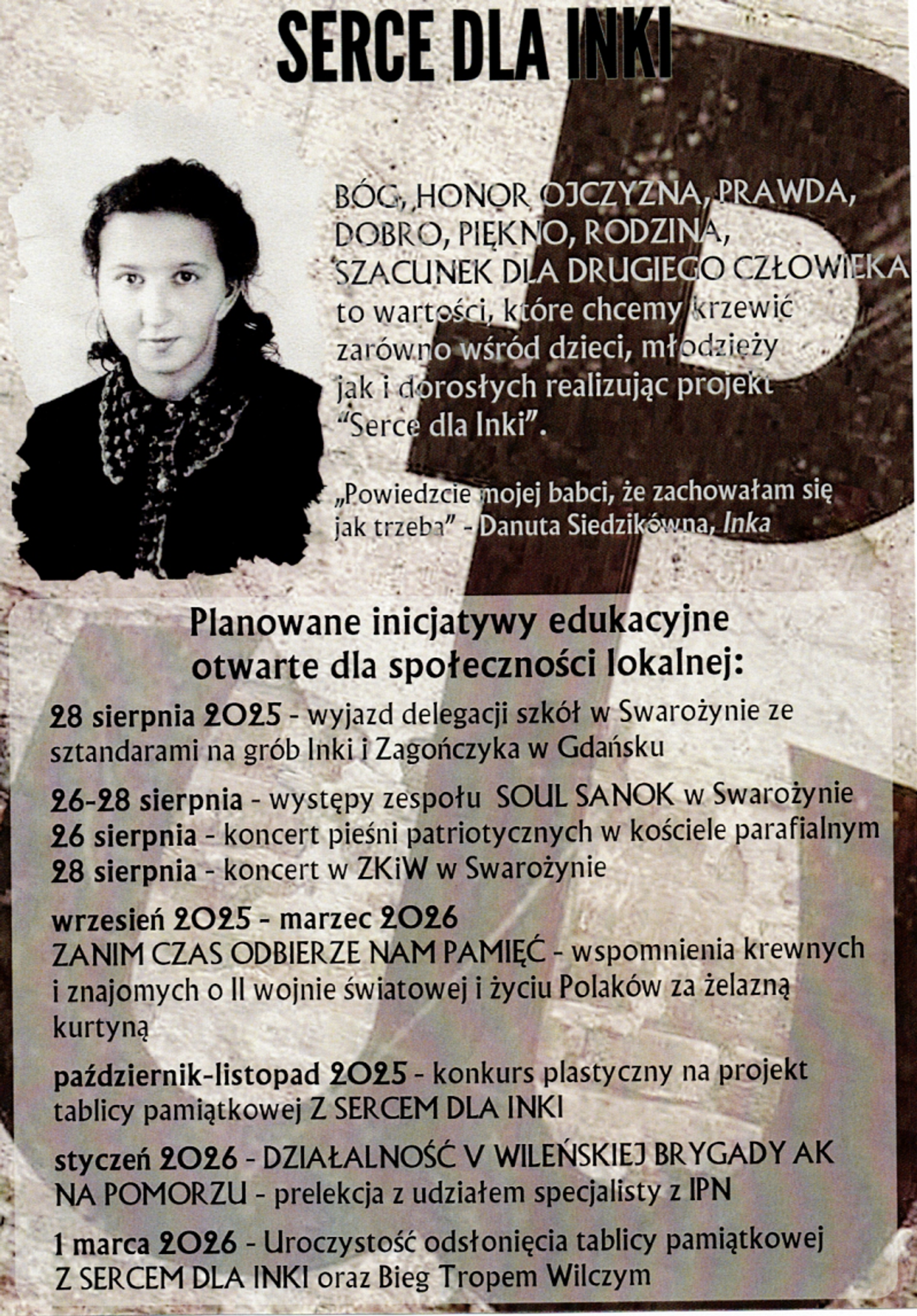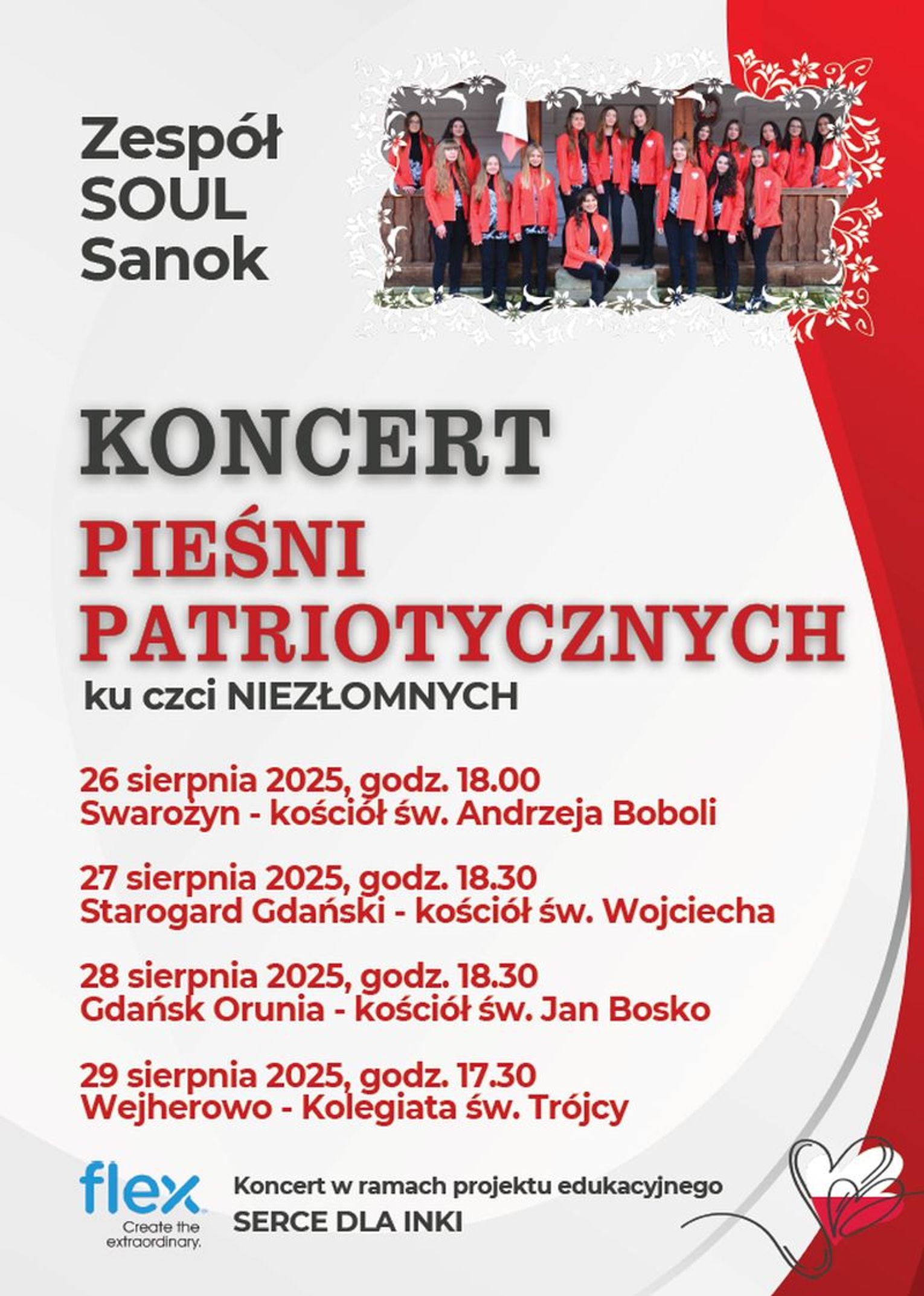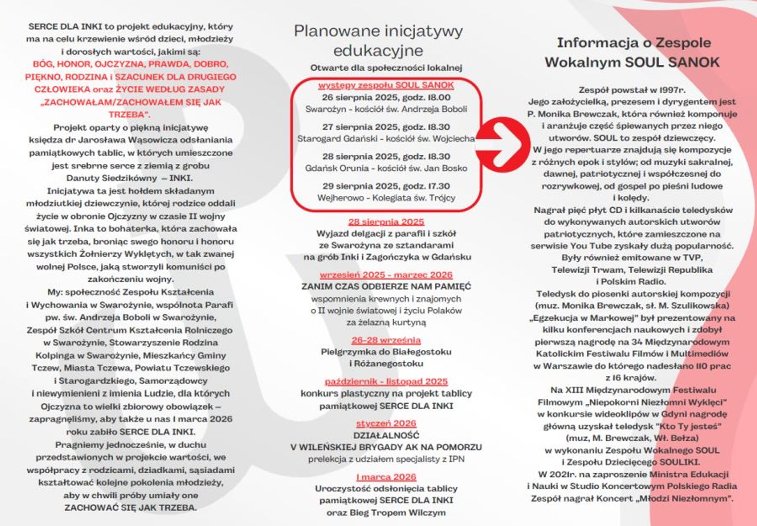 W ramach przygotowań do Serca dla „Inki” w Swarożynie, w dniach 26-30 sierpnia, na zaproszenie ks. proboszcza Piotra Malinowskiego, przybywa do Swarożyna zespół wokalny Soul Sanok – znany w kraju i za granicą z pięknego wykonania pieśni religijnych i patriotycznych. 15 obdarzonych pięknym głosem dziewcząt, licealistek i studentek, pod kierunkiem swej dyrygentki, kompozytorki i animatorki dr Moniki Brewczak, wystąpi na koncertach ku pamięci „Inki” i wszystkich żołnierzy wyklętych: 26 sierpnia wieczorem w Swarożynie, 27 sierpnia o 18.30 w Starogardzie Gdańskim (kościół św. Wojciecha – gospodarzem i animatorem uroczystości jest dziekan starogardzki ks. Janusz Lipski), 28 sierpnia (w rocznicę śmierci „Inki”) o 17.00 na Cmentarzu Garnizonowym, o 18.30 w kościele salezjańskim w Gdańsku Oruni, 29 sierpnia o 17.30 w kolegiacie Trójcy Świętej w Wejherowie, dokąd zaprasza serdecznie ks. prałat Tadeusz Reszka.
