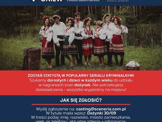 „Na potrzeby realizacji poszukujemy mieszkańców Gniewu – kobiet, mężczyzn i dzieci w różnym wieku – którzy mogliby wziąć udział w zdjęciach, jako statyści, w charakterze uczestników dożynek.