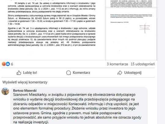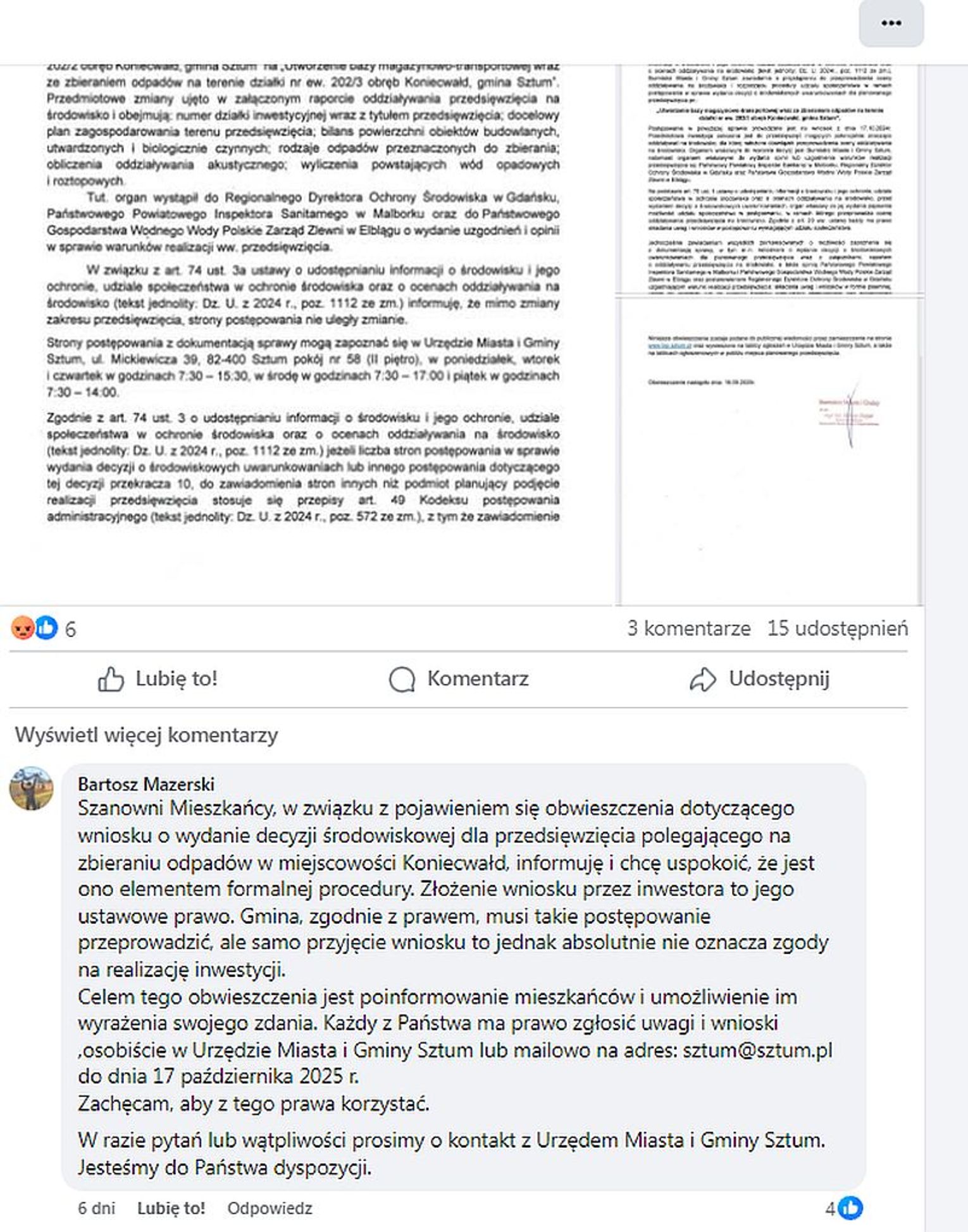 W związku z obwieszczeniem, które przytoczyliśmy głos zabrał burmistrz Sztumu, Bartosz Mazerski, który w komentarzu fan page'a Koniecwałdu napisał:
