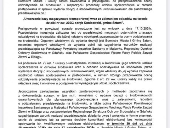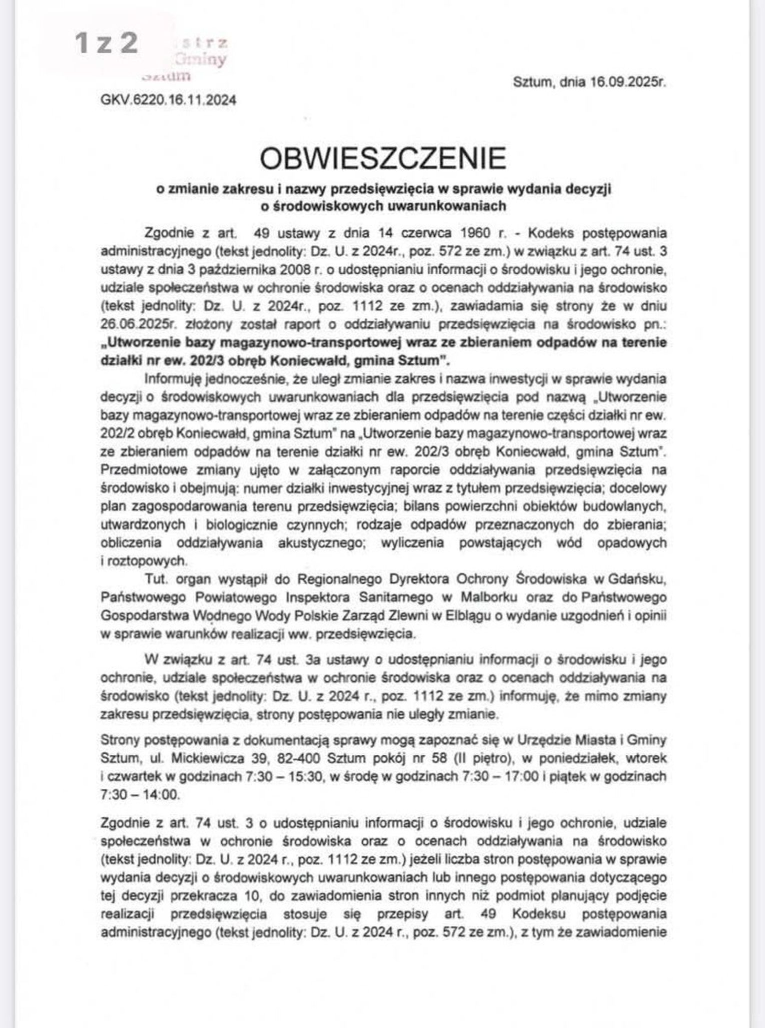 „(…) W obwieszczeniu datowanym na 16 września br. znajduje się informacja, że uległ zmianie zakres i nazwa inwestycji w sprawie wydania decyzji o środowiskowych uwarunkowaniach dla przedsięwzięcia pod nazwą "utworzenie bazy magazynowo transportowej wraz ze zbieraniem odpadów na terenie części działki nr ew. 202/2 obręb Koniecwałd, gm. Sztum" na - "utworzenie bazy magazynową transportowej wraz ze zbieraniem odpadów na terenie działki nr ew. 202/3 obręb Koniecwałd, gm. Sztum". Przedmiotowe zmiany ujęto w załączonym raporcie oddziaływania przedsięwzięcie na środowisko i obejmują numer działki inwestycyjnej wraz z tytułem przedsięwzięcia; docelowy plan zagospodarowania terenu przedsięwzięcia; bilans powierzchni obiektów budowlanych utwardzonych i biologicznie czynnych rodzaje odpadów przeznaczonych do zbierania obliczenia oddziaływania akustycznego; wyliczenia powstających wód odpadowych, wód, opadowych i roztopowych. (...)”.