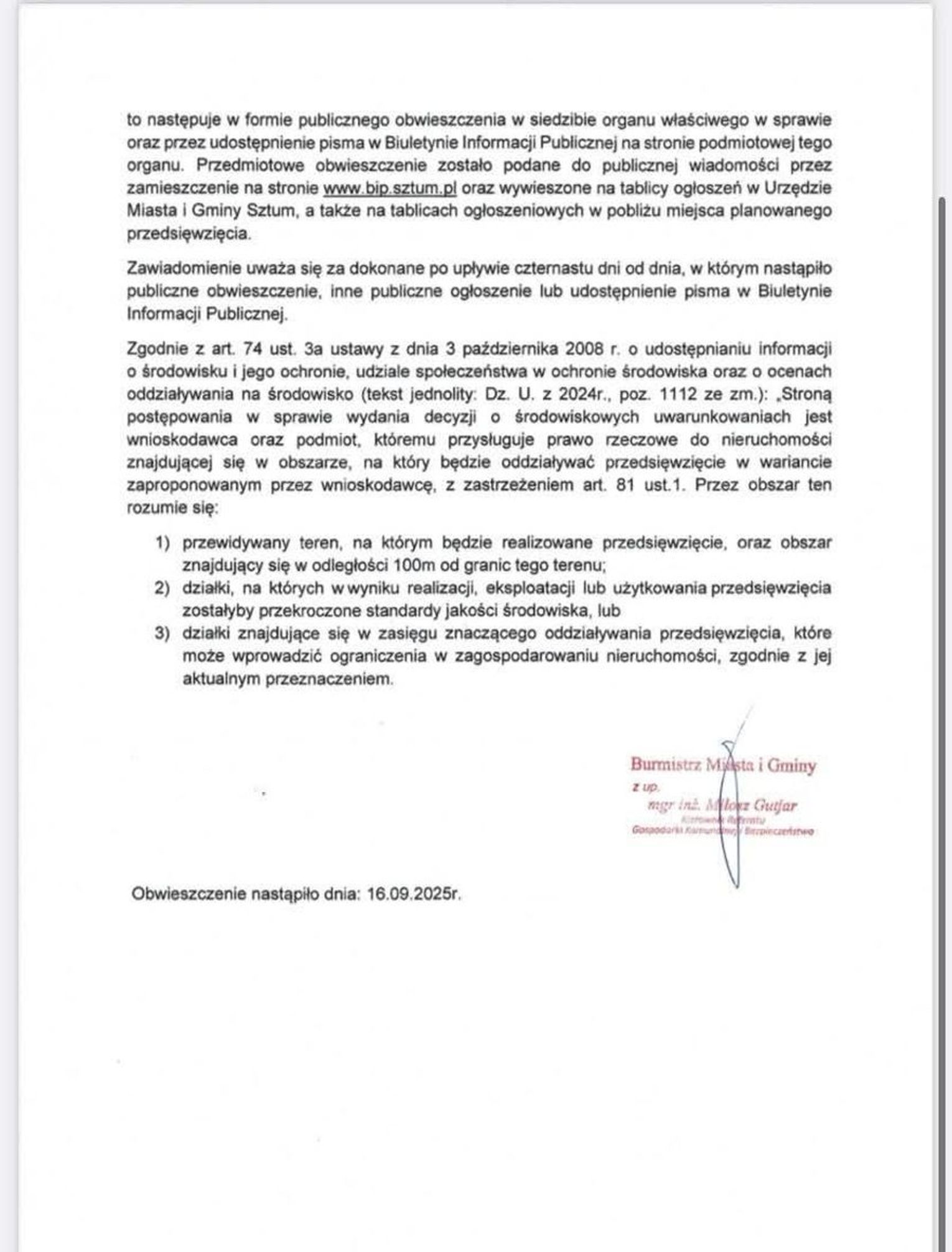 Celem tego obwieszczenia jest poinformowanie mieszkańców i umożliwienie im wyrażenia swojego zdania. Każdy z Państwa ma prawo zgłosić uwagi i wnioski ,osobiście w Urzędzie Miasta i Gminy Sztum lub mailowo na adres: [email protected] do dnia 17 października 2025 r.