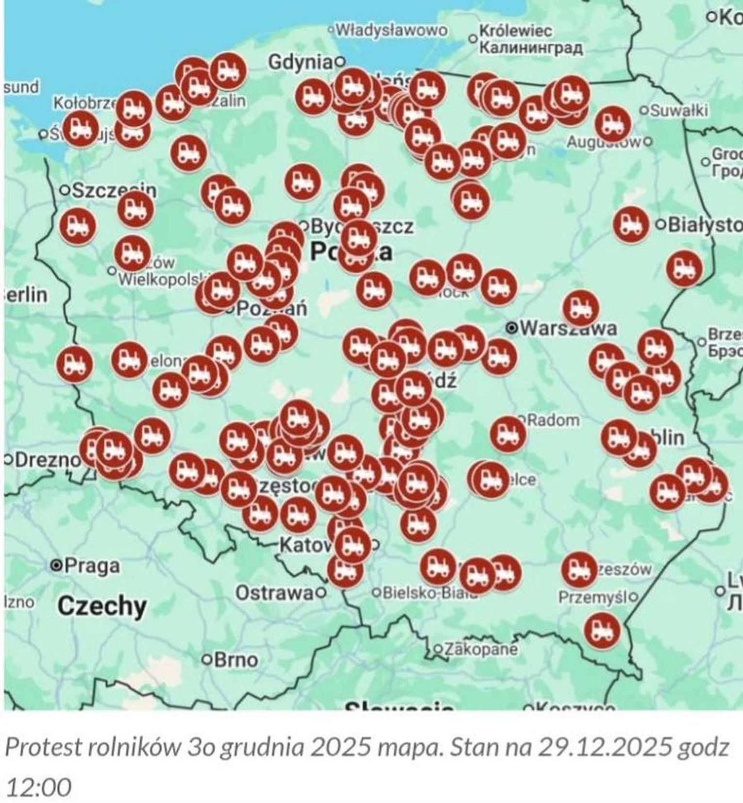 Patrząc na udostępnioną mapę to ok. 150 miejsc pikiet i manifestacji. Protesty mają charakter pokojowy. Zwykle to przejazdy oflagowanych ciągników i maszyn rolniczych w widocznych miejscach. Na transparentach umieszczono hasła STOP MERCOSUR czy naklejki na pojazadch “Protest rolników”. W całym kraju wystąpienia zaplanowano na godz. 10.00-15.00.
