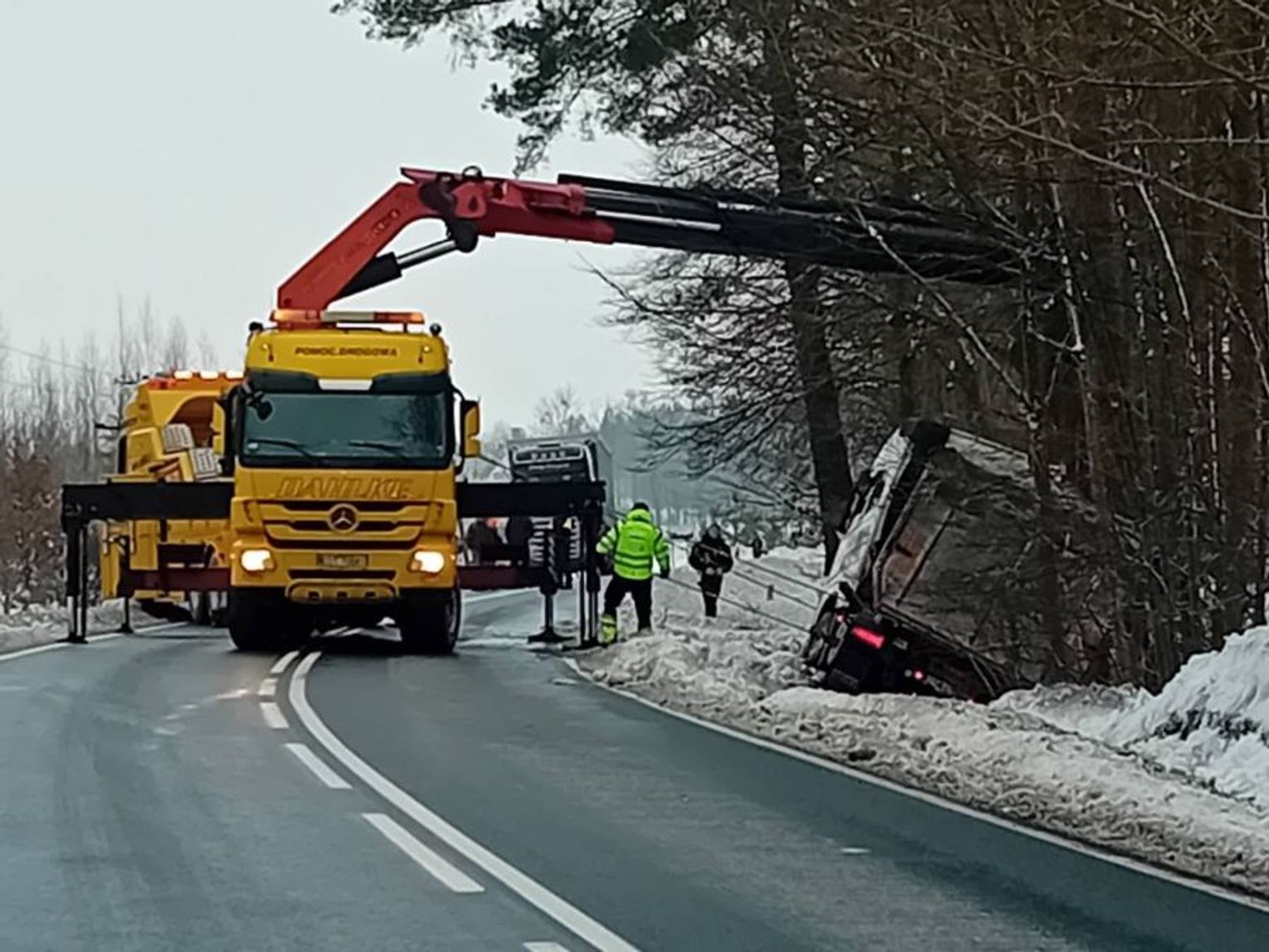 Jak poinformował policjant z biura prasowego Komendy Powiatowej Policji w Kwidzynie, funkcjonariusze zostali skierowani do zabezpieczenia miejsca zdarzenia, ograniczenia ruchu od strony Kwidzyna oraz kierowania kierowców na objazdy w stronę Ryjewa. Na czas pracy dźwigu wprowadzono ruch wahadłowy. Po obu stronach drogi szybko utworzyły się długie korki.