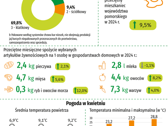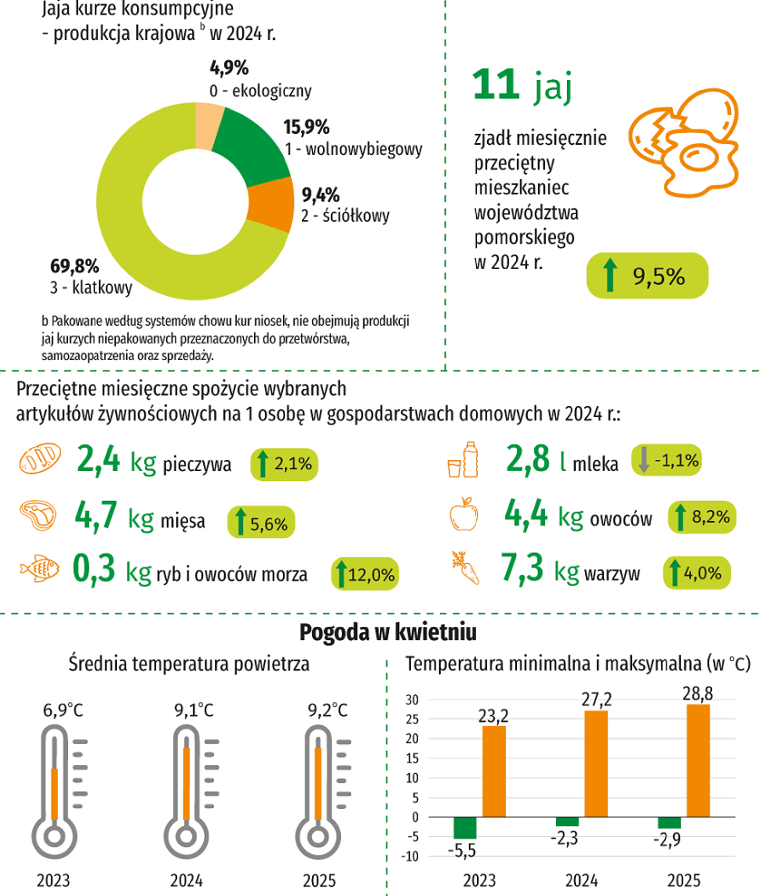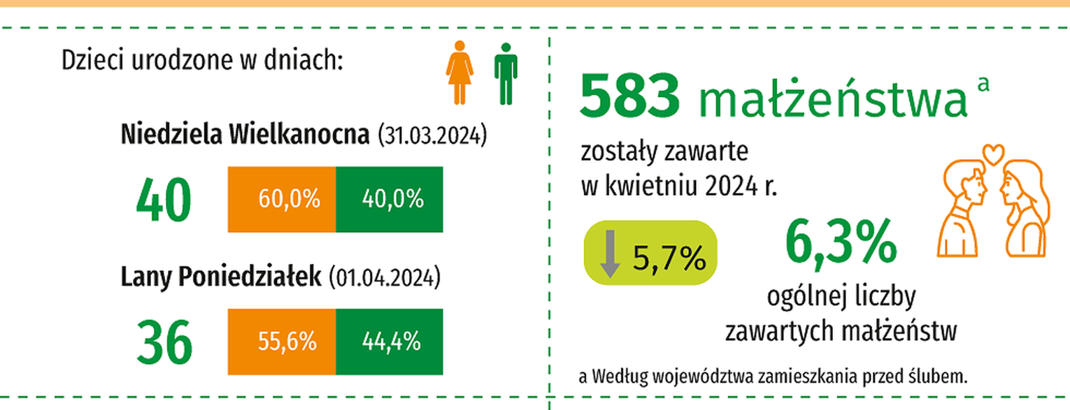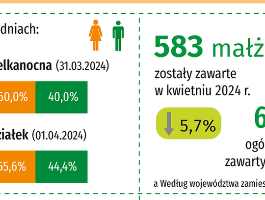 GUS (Główny Urząd Statystyczny) podaje kilka interesujących zestawień danych dotyczących dni wielkanocnych w minionych latach. Można się z nich dowiedzieć np. iż w kwietniu 2024 o 5,7 proc. zmalała liczba zawieranych małżeństwa. Zaskoczyło nas wzrost spożycia jaj w 2024 o 9,5 proc. O ponad połowę zmalała średnia procentowa sum opadów w stosunku do 2023 i 2024 r.