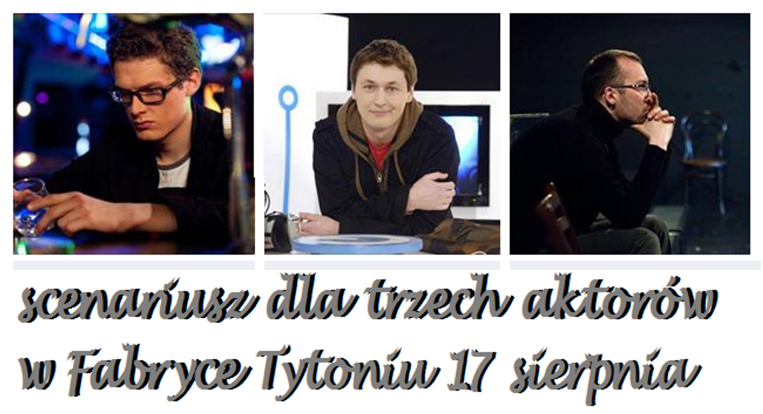 Spektakl „ Scenariusz dla trzech aktorów” wg tekstu Bogusława Schaeffera pod tym samym tytułem to, określając w największym skrócie, kabaret teatralny. Tekst, napisany pod koniec lat sześćdziesiątych, skrzy się tak nieprawdopodobnie aktualnym dowcipem językowym, sytuacyjnym, że aż momentami trudno uwierzyć, że ma już tyle lat. Prosta historia o nieudanej próbie zrobienia spektaklu przez dwóch aktorów i reżysera pełna jest przezabawnych gagów, zarówno tych napisanych przez Schaeffera, jak i improwizowanych na żywo przez wykonawców. Najsłynniejszego wystawienia tekstu Schaeffera dokonał Mikołaj Grabowski wraz z Andrzejem Grabowskim i Janem Peszkiem w 1988 roku.