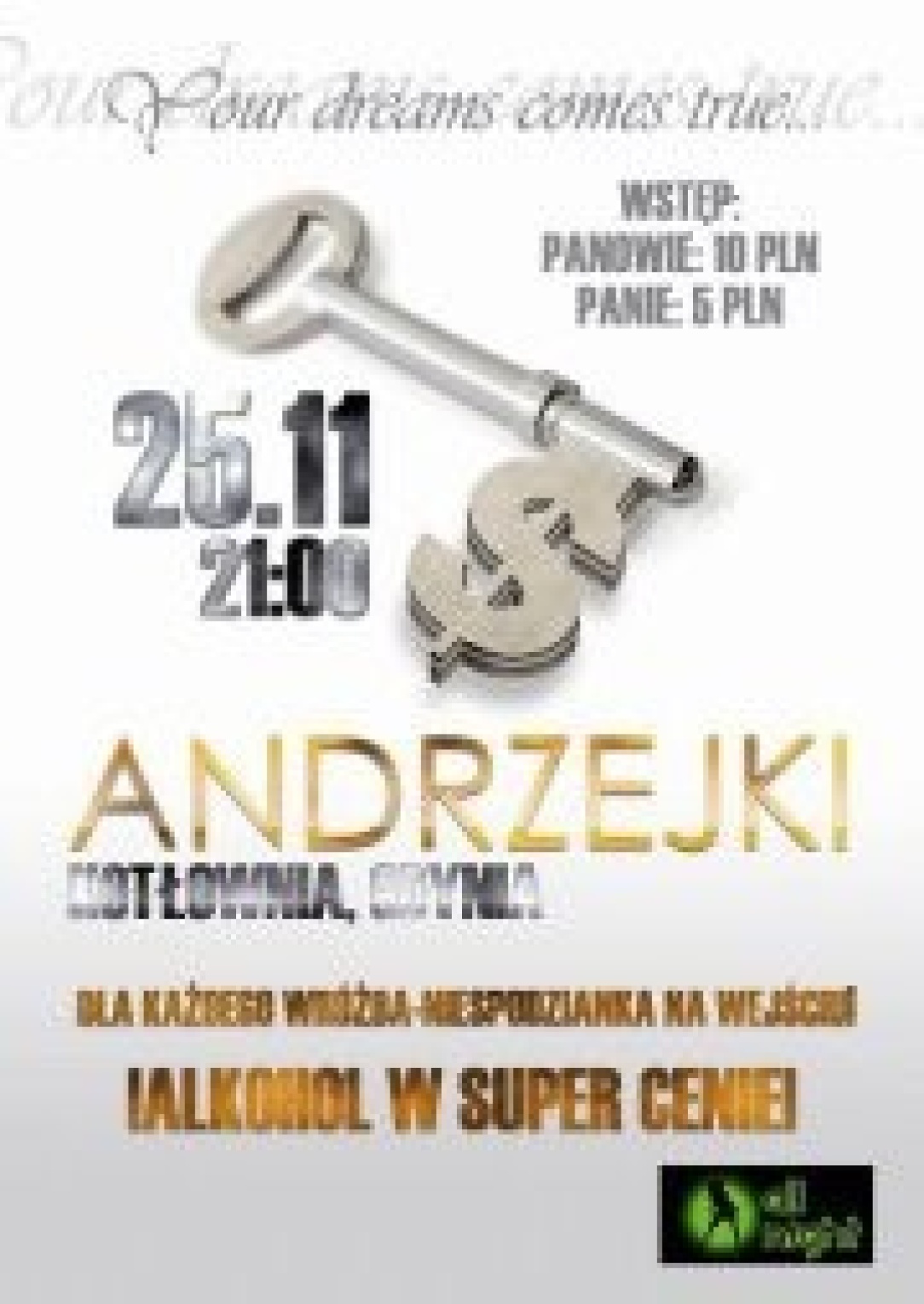 Panie wchodzą za jedyne 5zł, a panowie 10zł. Z racji takiej, że to Andrzejki to wszyscy Andrzejowi po okazaniu dowodu tożsamości wchodzą za darmo ;)