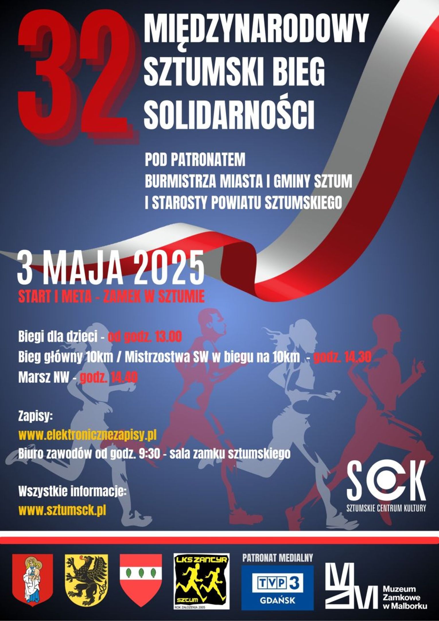Już 3 maja br. odbędzie się 32. Sztumski Międzynarodowy Bieg Solidarności i Marsz Nordic Waking. Zapowiada się wyjątkowa atmosfera, doskonała organizacja, doborowi współzawodnicy i piękna trasa nad sztumskim jeziorem. To wszystko czeka na na Was, 3 -go maja w Sztumie. Serdecznie zachęcamy do udziału w tej najstarszej i najsympatyczniejszej imprezie biegowej na Powiślu.